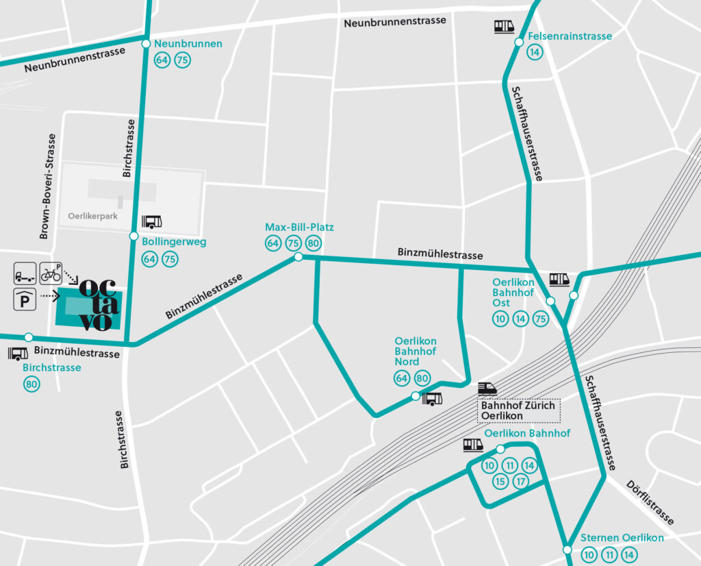 Das Octavo ist ab Bahnhof Oerlikon in nur 8 Minuten zu Fuss erreichbar. Alternativ führt die Linie 80 zur Bushaltestelle „Birchstrasse“ direkt neben dem Gebäude. An der Birchstrasse befindet sich zudem eine Veloausleihstation von PubliBike.